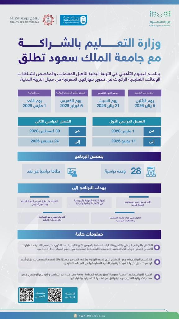 وتحقيقاً لمبادرة وزارة التعليم لتعزيز المشاركة الرياضية للطالبات في المدارس، أعدت جامعة الملك سعود ممثلة بكلية علوم الرياضة والنشاط البدني برنامج الدبلوم العالي التأهيلي في التربية البدنية للمعلمات، بهدف تطوير كفاءات ومهارات المعلمات الحاصلات على البكالوريوس في التخصصات التربوية وتأهيلهن للعمل في مجال التربية البدنية والأنشطة اللاصفية بالمدارس بما يتوافق مع مناهج وزارة التعليم للمراحل التعليمية المختلفة.